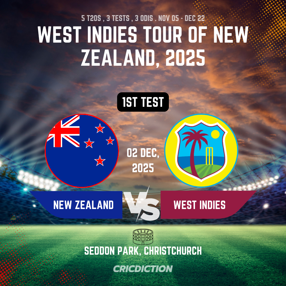 The highly anticipated 1st Test match between New Zealand and West Indies is all set to take place as part of the West Indies tour of New Zealand in 2025. The match is scheduled to be held at Hagley Oval in Christchurch on December 02 at 10:00 am local time, which translates to 10:00 pm GMT and 03:30 am IST.